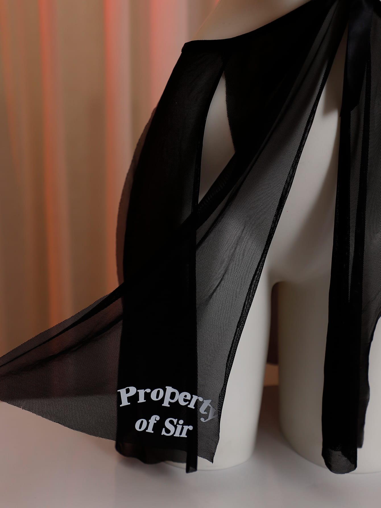 The sheer double slit dress design features twin high side slits that climb to the hip, revealing and accentuating the submissive body in movement.