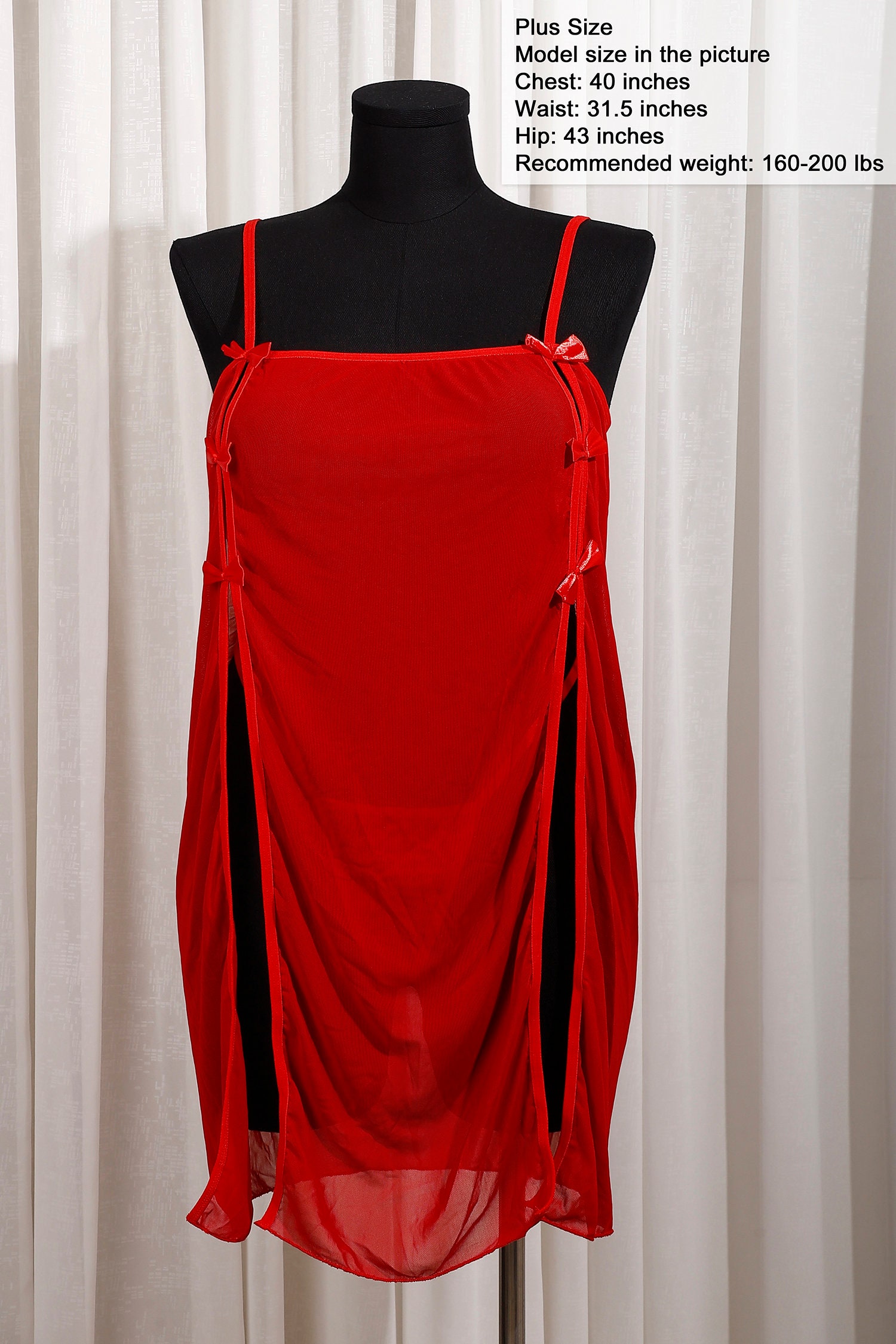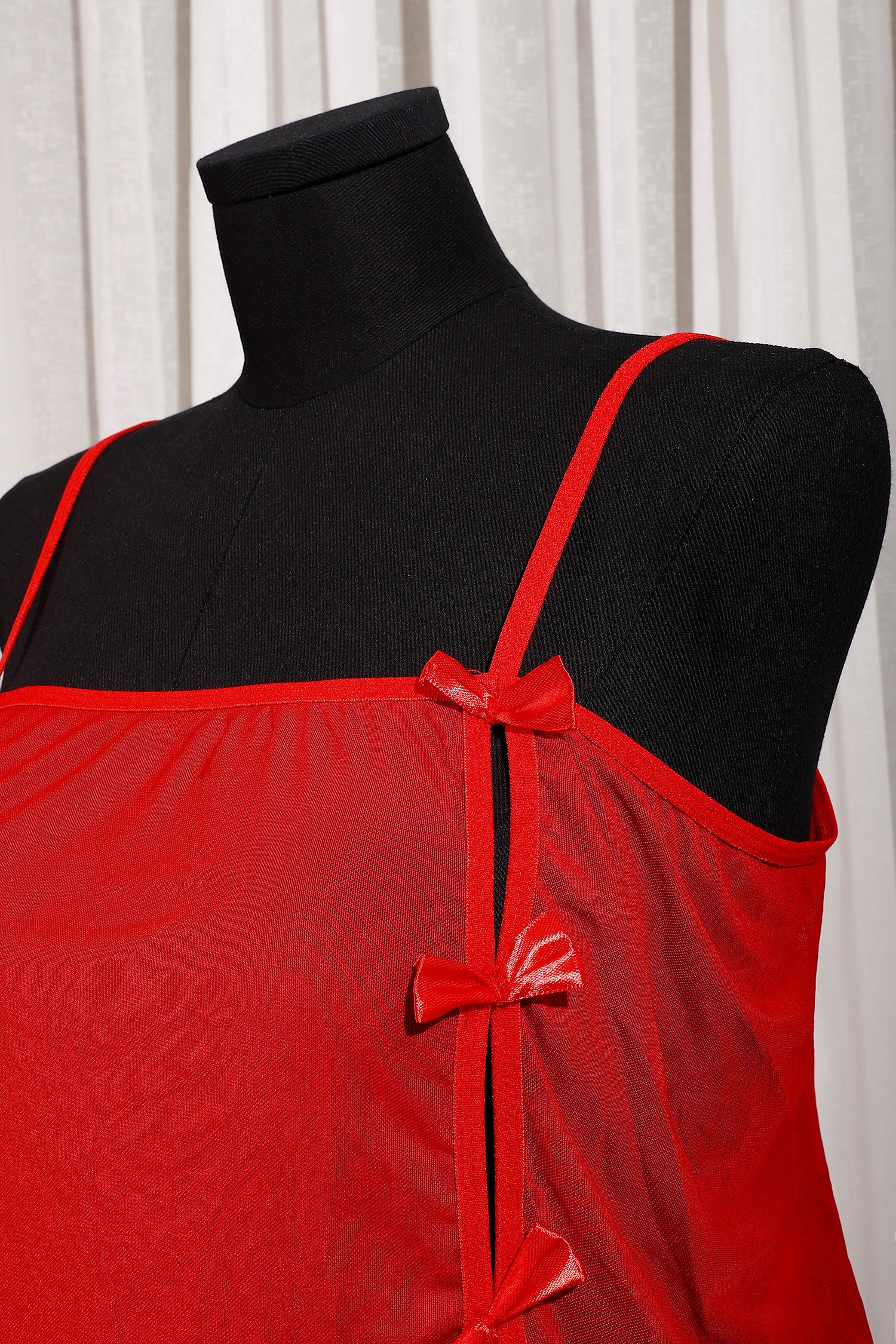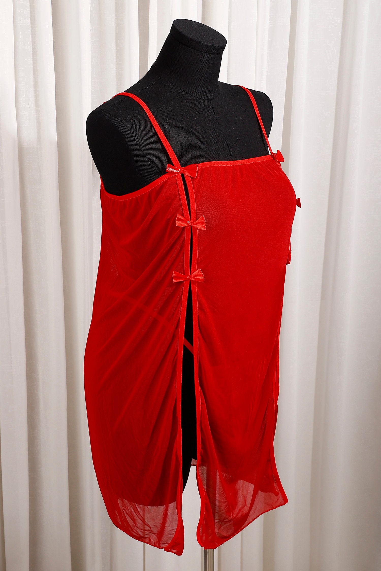 A sheer red kajira outfit with daring side slits, tied bows, and lightweight mesh. Designed for submissive rituals, D/s scenes, or collaring nights.