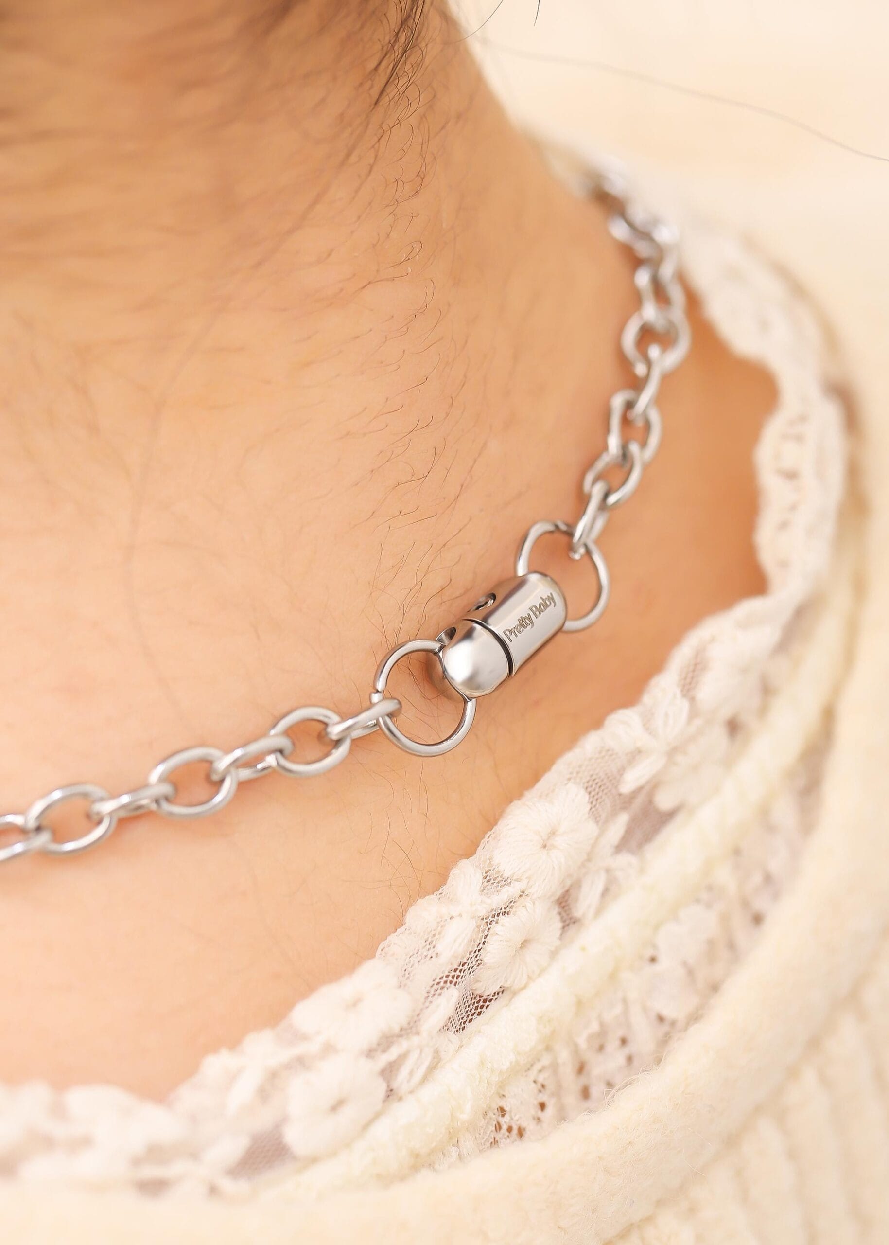 A lockable submissive collar featuring dual heart charms in mixed metals, a hex clasp engraved with “Pretty Baby,” and thick chain for confident daily wear.