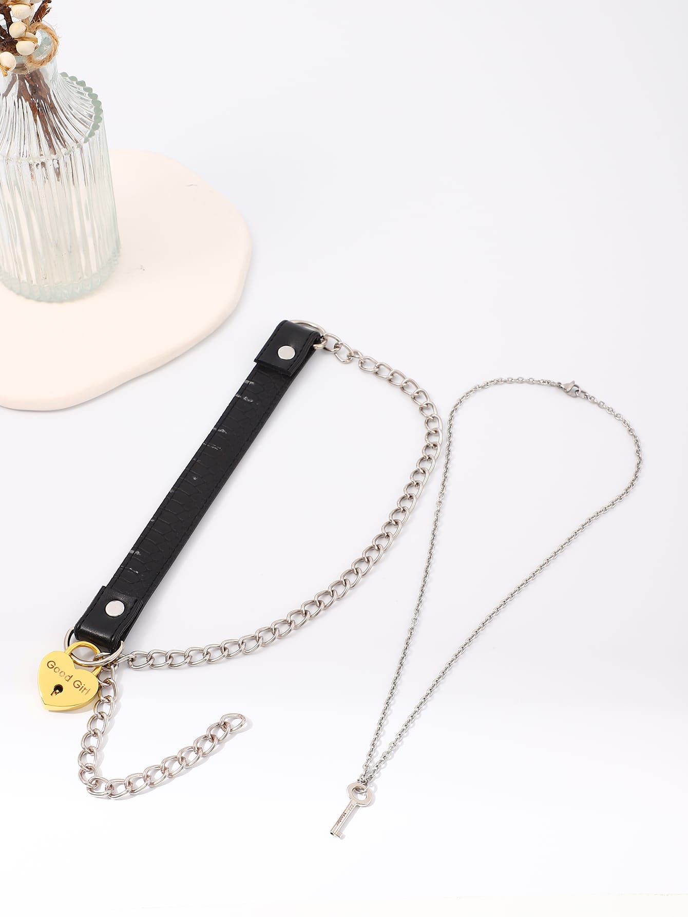 A lockable BDSM collar engraved with “Good Girl” — secure, symbolic, and beautifully discreet. Includes matching key necklace.