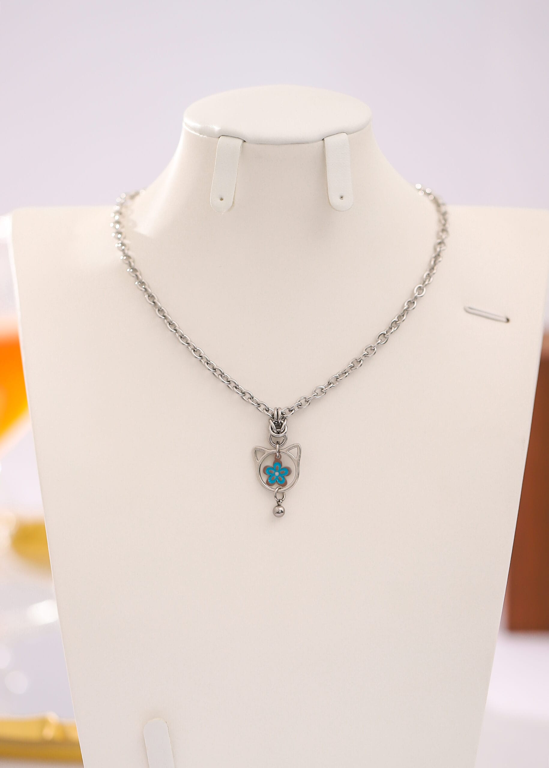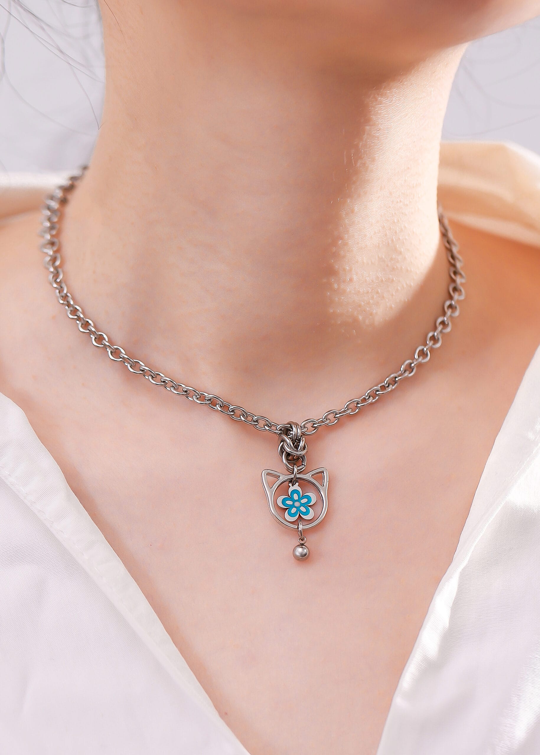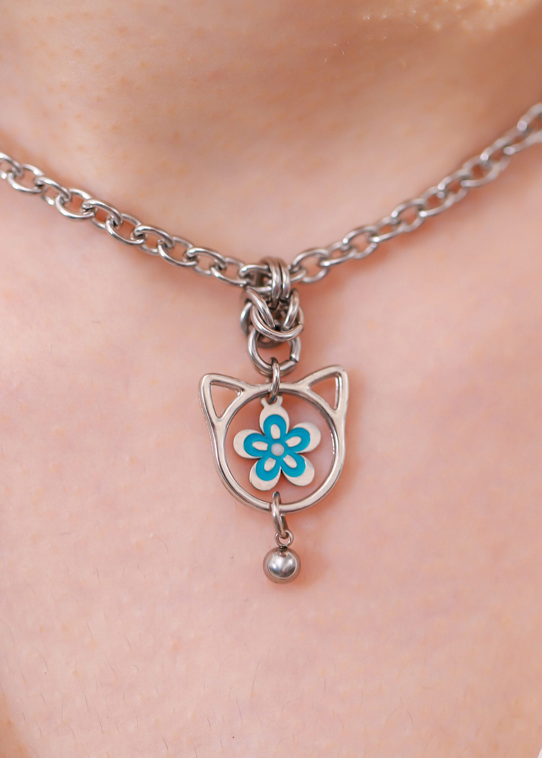 This lockable kitten collar blends playful charm with lasting symbolism. Designed in stainless steel for durability, it features a blue enamel flower pendant framed in cat ears, finished with a soft chime bell — a gentle reminder of connection and control.